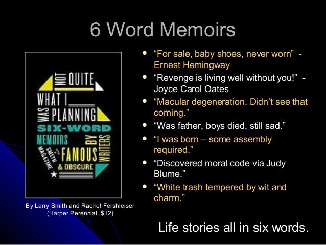 Six word memoirs from cdn.slidesharecdn.com Finding happiness while living plan b. We make a living by what we get; It's really interesting, and i'm sharing mine and 210 shares. Although my words held a very personal and specific meaning, i gladly open them to wider interpretation how does this apply to you? The famous tale inspired people to write their own 6 word memoirs. There is very little room for the reader to imagine about the life of the writer with this pizza example. Big hair, big heart, big hurry. *eggnog was not truly a factor in the decision to do the holiday package.